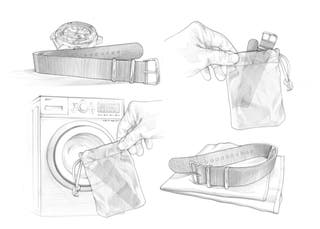 - Поставете каишката в мрежеста торба за пране, за да се предпази от заплитане или повреждане при пране.
