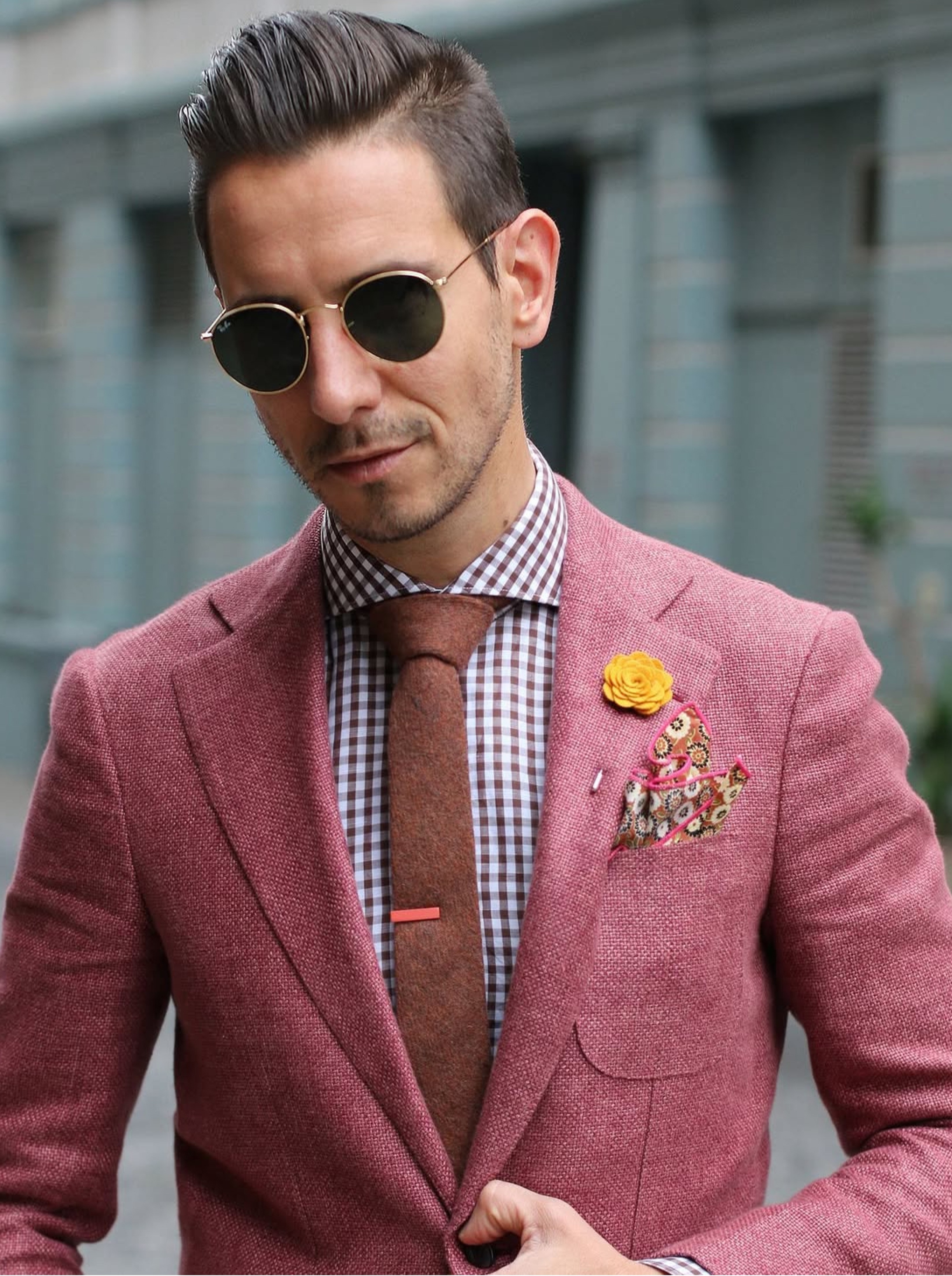 Ярък, но изискан пролетен външен вид, включващ розов блейзър, който излъчва увереност и чар. Ризата с десен и тясната вратовръзка добавят текстура, докато иглата за ревер във форма на цвет, внася сезонен акцент. Съчетан с кръгли слънчеви очила, този изискан тоалет е идеален за изпъкване с непринудена елегантност, докато показва индивидуалност.