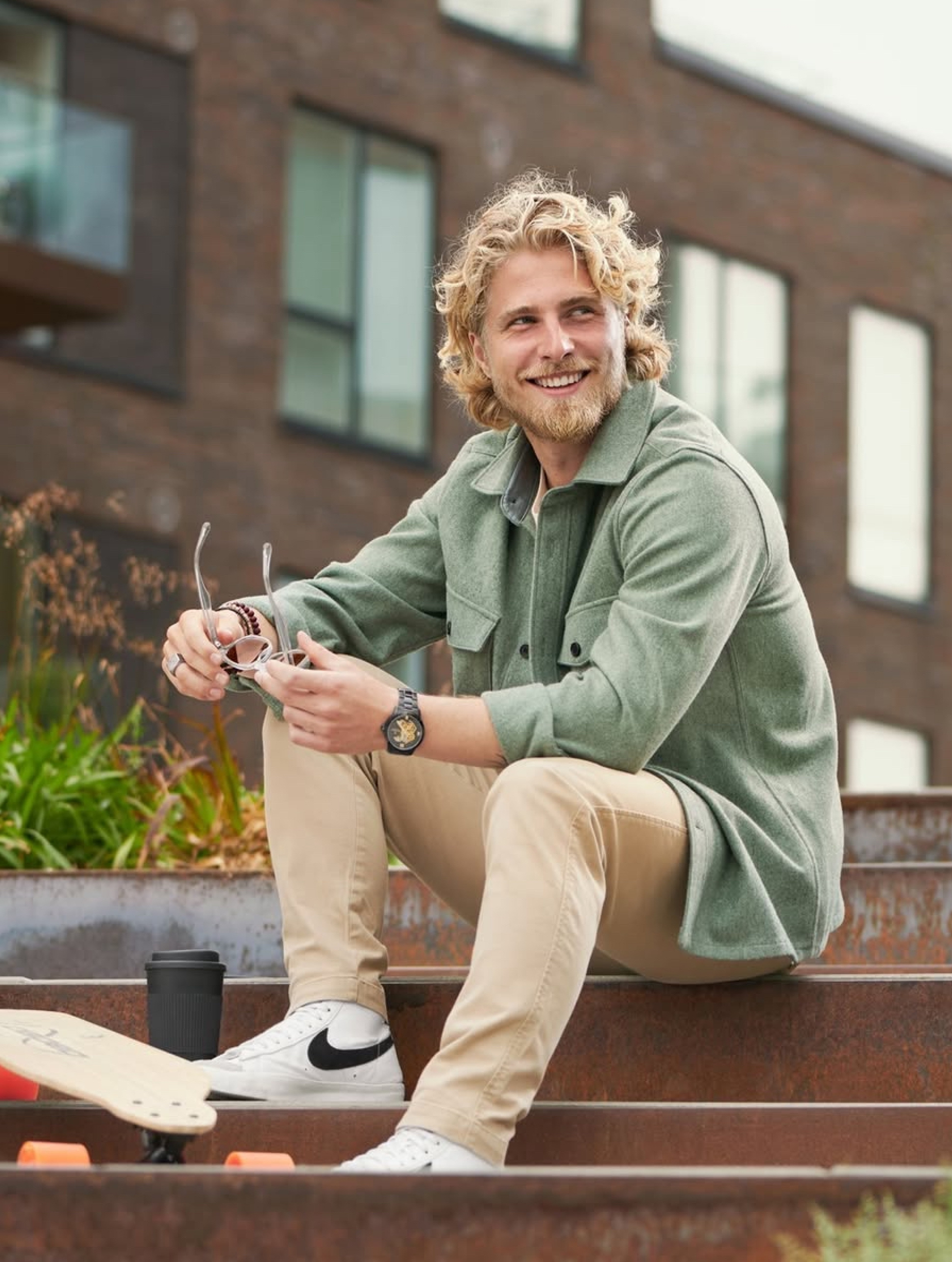 За тези, които жадуват за приключение, този комплект съчетава практичност с модерен стил. Маслено-зелена риза служи като централен акцент, предлагайки както комфорт, така и универсалност. Това е визия, създадена за заетия мъж, който безпроблемно преминава от градските улици към бягства на открито. Със сдържани аксесоари като часовник в неутрални тонове, този ансамбъл изглежда стабилен и същевременно стилен без усилие.