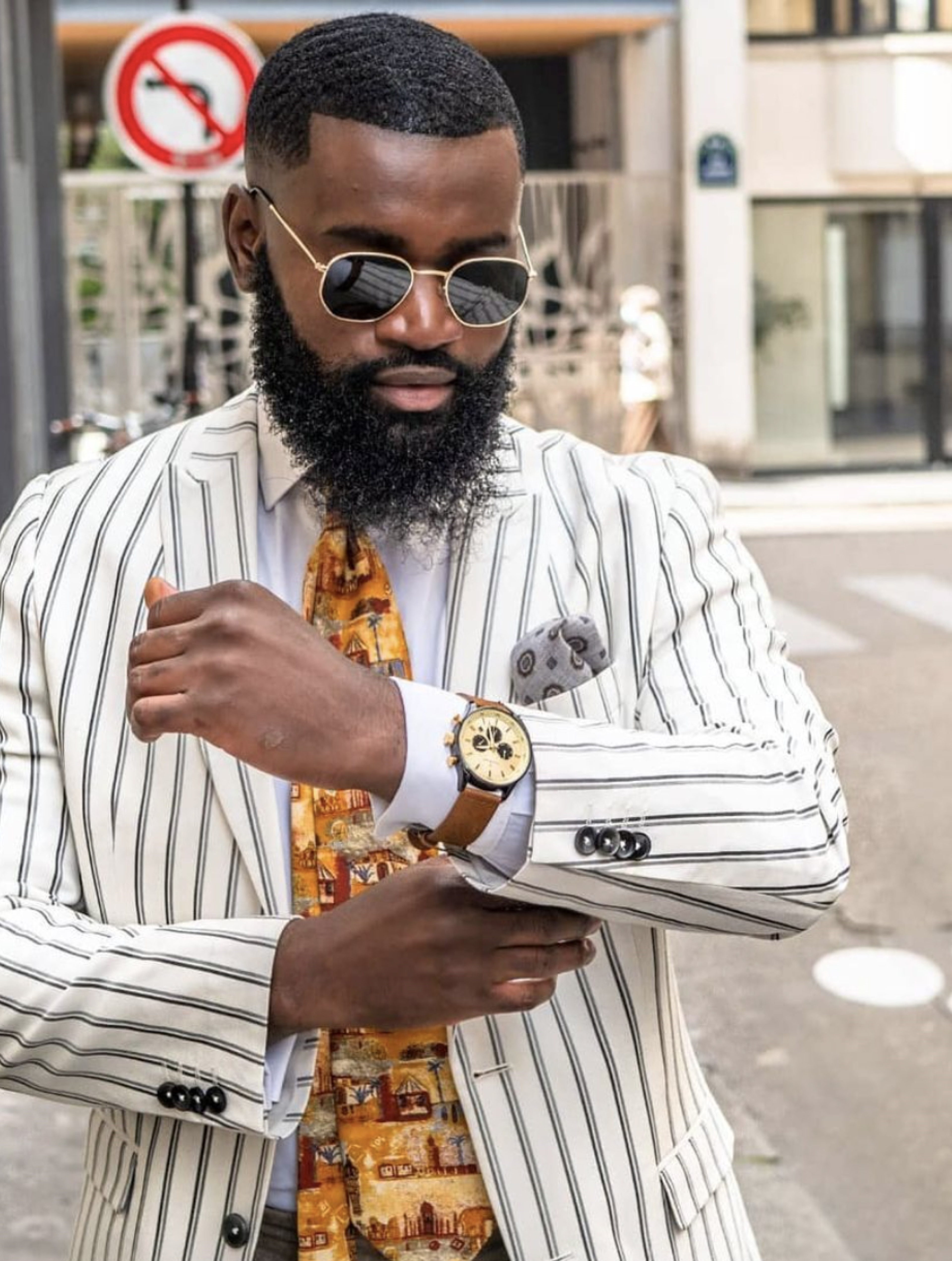 Смел, но изискан, този тоалет е за мъжа, който не се страхува да смесва шарки и текстури. Раираното сако и ризата с принт създават изискан контраст, идеален за впечатляващи изяви, докато запазват елегантност. Идеален за вечерни партита или стилни градски излизания.