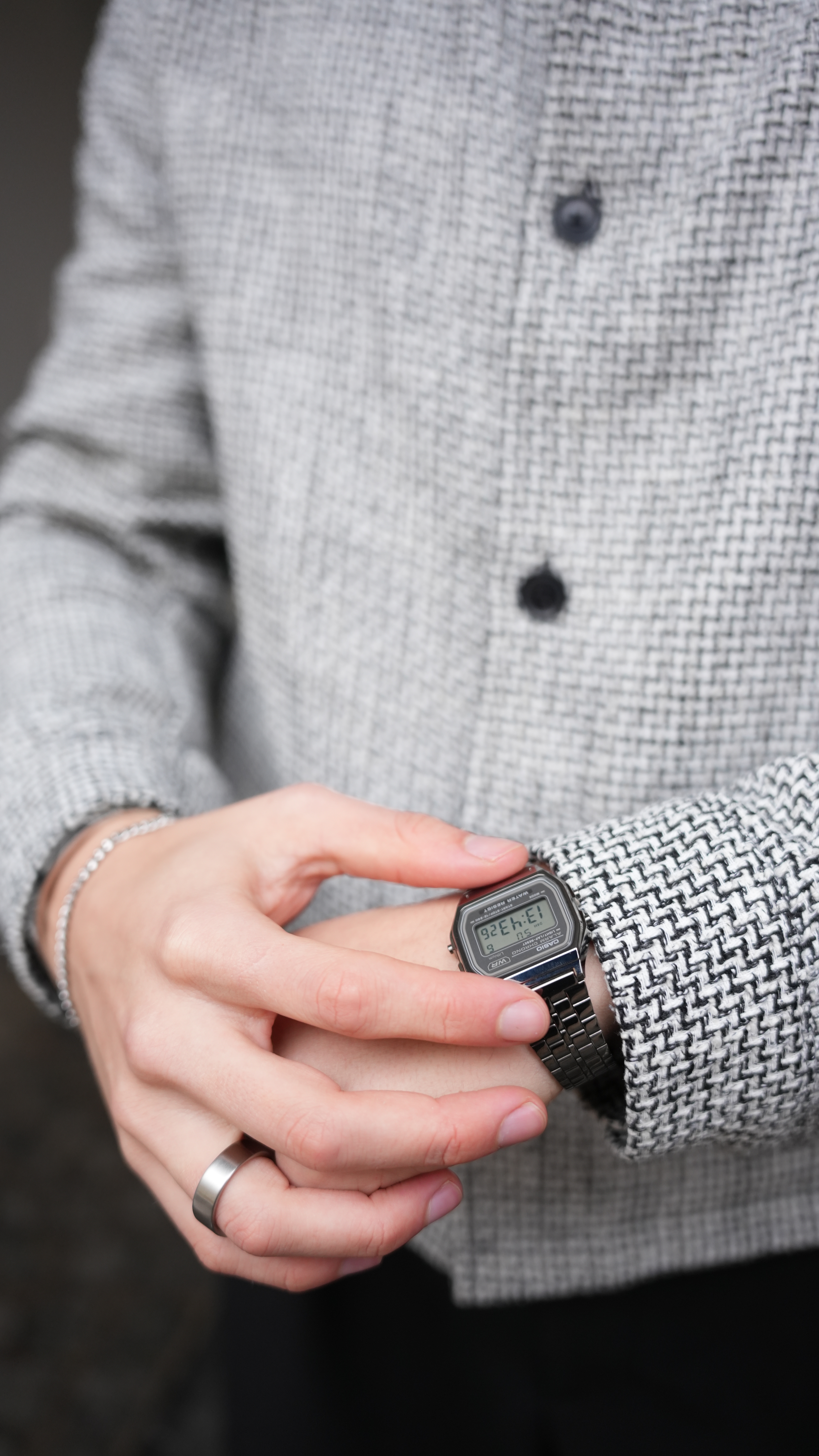 На ръката матираната външна повърхност изглежда сдържано и съвременно, а полираният вътрешен ръб улавя светлината при движение. Плоската форма стои добре самостоятелно или в комбинация с други рингове, а неутралният сребристо-стоманен тон подхожда както на ежедневни, така и на по-елегантни тоалети. Дизайнът е изчистен, с повърхности, които балансират мат и блясък.