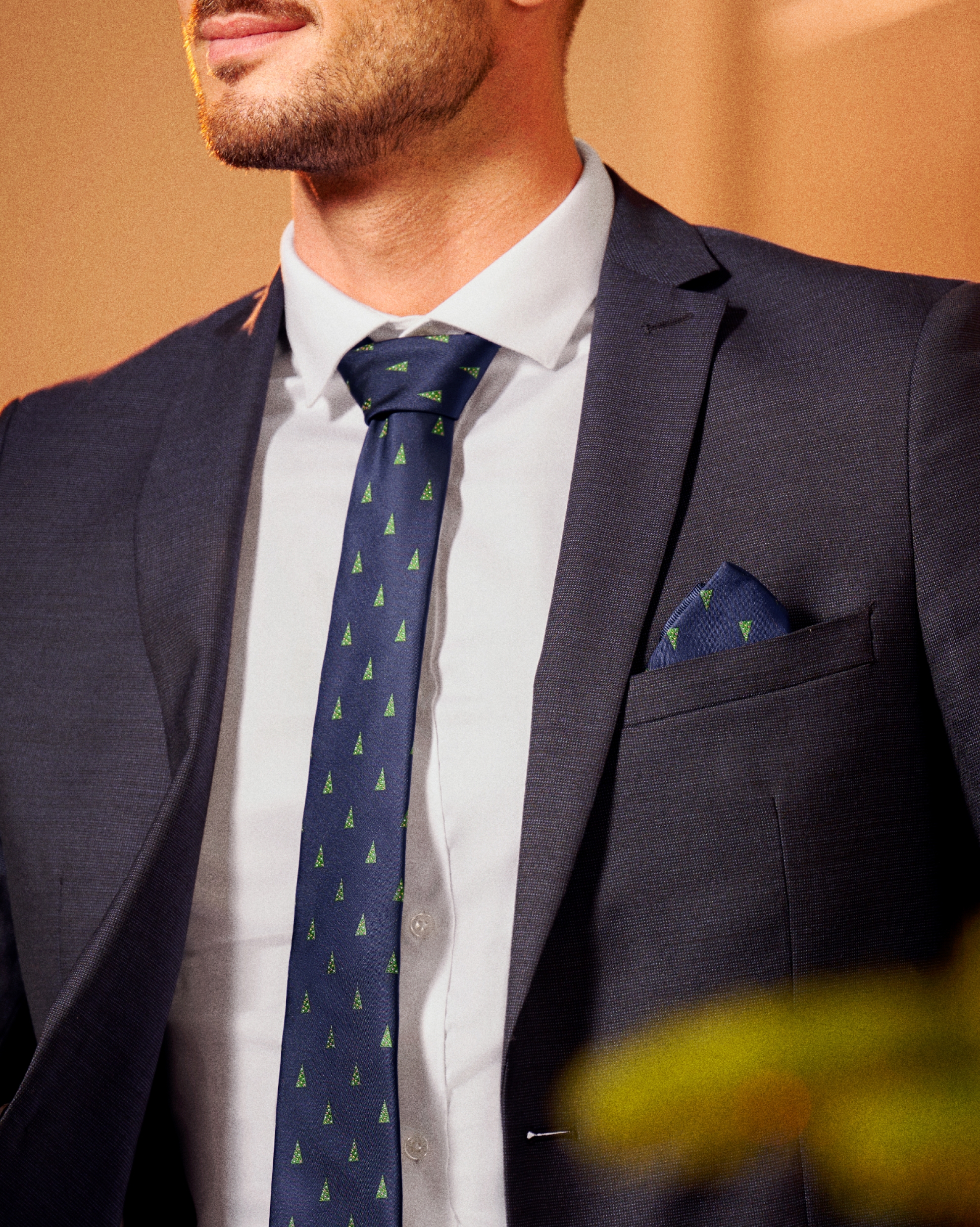 Тази джобна кърпичка е изработена от гладък полиестер и има малък повтарящ се триъгълен мотив върху дълбоко син фон. Тъканата материя има чиста завършеност и меко усещане, задържа рязки сгъвки и остава лека. Десенът добавя дискретен акцент, без да доминира ризата или сакото.