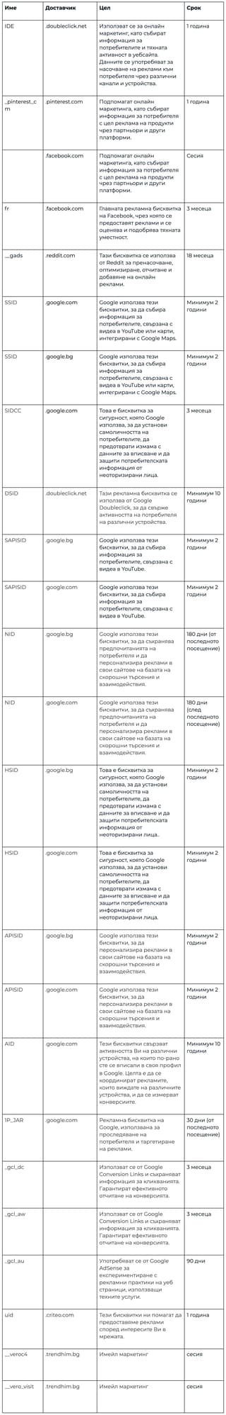 Ние си служим с проследяващи, статистически и технически бисквитки. За да Ви дадем възможно най-пълна информация, сме описали повечето от тях по-долу:
