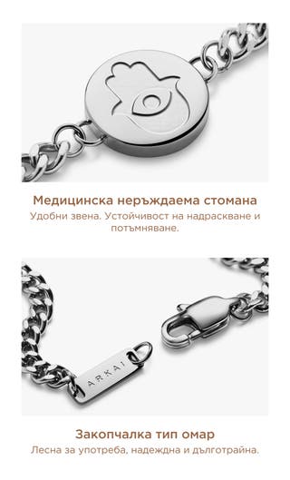 Тази гривна е изработена от неръждаема стомана 316L с полирана сребристо-стоманена повърхност. В центъра е малка кръгла табелка с мотив Хамса. Фината верижка и гладкото покритие подчертават прецизното изпълнение и семпъл, модерен вид. Металът без никел намалява риска от кожни раздразнения.