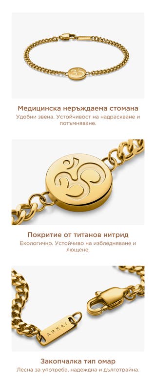 Тази гривна е изработена от 316L неръждаема стомана, с топло златисто покритие и нисък профил на кръглия медальон, гравиран със символа Om. Гривната с плоски звена и полиран финиш има изчистен вид, а гравировката е ясна и прецизна. Металът е без никел, за да намали раздразненията по кожата.
