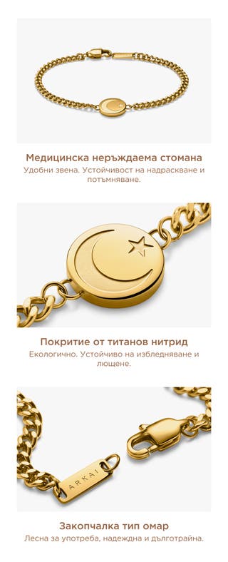 Тази гривна е от 316L неръждаема стомана с топло златно покритие и малък овален медальон, гравиран с полумесец и звезда. Веригата с плоски звена и нископрофилен карабин оформя полиран силует. Гладките звена и прецизните детайли ѝ придават сдържан и лесен за носене вид.